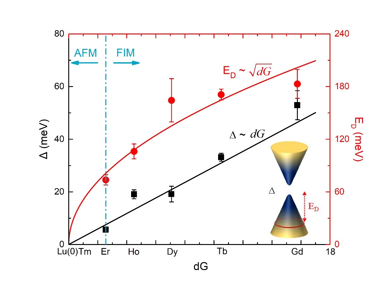 RMn6Sn6系列样品的狄拉克锥能量ED和能隙△,二者的系统演变分别与稀土元素的de Gennes因子呈平方根和线性关系;内插图是具有陈数能隙的狄拉克锥