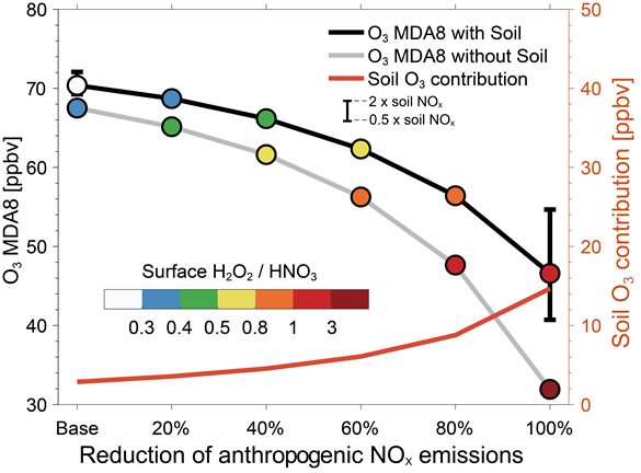 图2 土壤氮氧化物排放抑制了大气臭氧对人为氮氧化物排放的敏感性:黑线和灰线分别代表空气质量数值模型在有/无土壤氮氧化物排放情景下,华北平原臭氧浓度对人为氮氧化物排放下降20%~100%的响应(左轴);红线表示土壤氮氧化物排放在不同人为排放情景下对大气臭氧生成的贡献,即黑线和灰线之差(右轴)