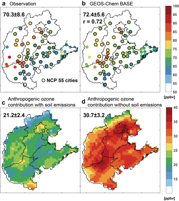 图1 土壤氮氧化物排放对华北平原夏季近地面臭氧污染人为源贡献估算的影响:(a)和(b)分别展示了2017年7月华北平原城市站点观测和模拟的月均最大臭氧8 h浓度值的空间分布;(c)和(d)分别展示了在有/无土壤氮氧化物排放的情景下通过数值模型计算的人为排放源所致臭氧贡献值