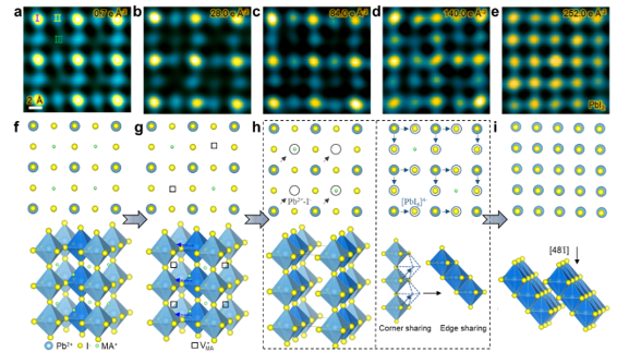 MAPbI3在原子尺度上的分解路径:(a-e)随着剂量增加,逐渐分解为PbI2过程的高分辨透射电镜(HRTEM)图像;(f, g)MAPbI3和MA0.5PbI3的原子结构,其中黑色方块表示V-MA,(h)I-和Pb2+的两类原子扩散,其中左侧显示I-和Pb2+扩散到V-MA,右侧显示[PbI6]4-八面体从角连接通过八面体滑移变为棱连接;(i)PbI2的原子结构