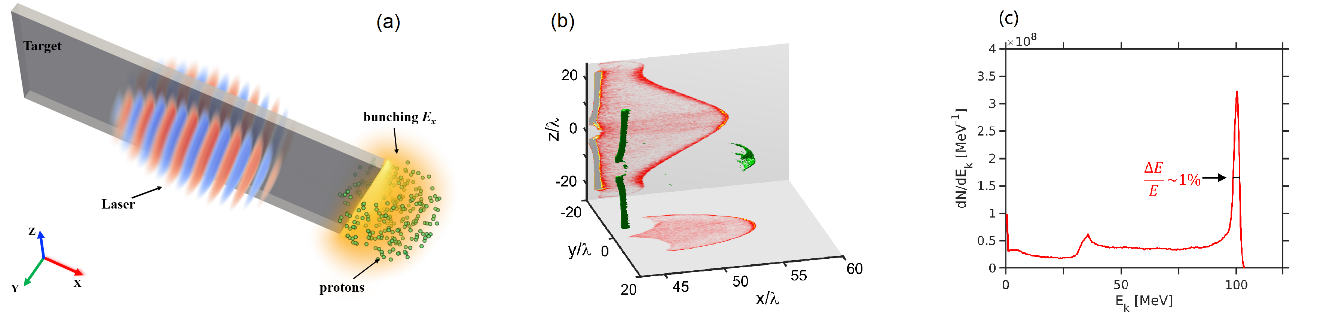 强激光离子源具有比传统射频源高三个数量级以上的加速电场,有望实现加速器的小型化、商业化,在聚变能源、医疗健康、核物理和粒子物理等领域都有重要的应用前景。目前,实验上获得的质子能量最高接近100 MeV,但其能谱呈现指数下降的宽谱特征严重限制了在癌症治疗等方面的应用。事实上,在目前已知的诸多激光离子加速机制中,由于受到激光器条件和不稳定性的影响,如何获得达到医疗临床要求的能散在1%量级的准单能离子束长期悬而未决。