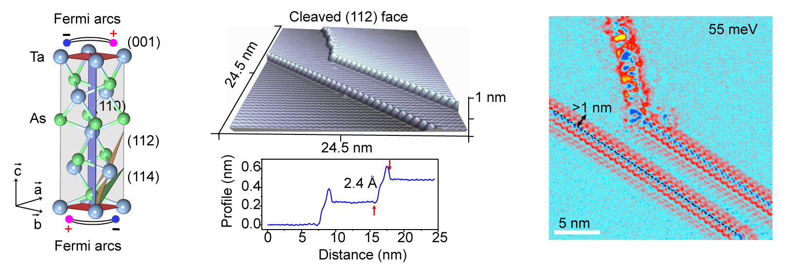在砷化钽(TaAs)晶体中,由于对称性破缺会产生手征外尔点。当投影于晶面后,会形成连接不同手征外尔点且受晶体拓扑性保护的非闭合费米面—费米弧,如图(左)所示;此时的晶面具有费米弧拓扑态,例如(001)晶面,而(110)晶面上由于不同手征外尔点会投影于晶面的同一点,因此不确定是否具有这种费米弧拓扑态。实际上,TaAs晶体中还存在(112)、(114)等可能被解离或易于在晶体表面表现的晶面,但人们对这些晶面上的拓扑态信息知之甚少。