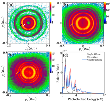 图1 单色圆偏(a)、双色同向旋(b)、双色反向旋(c)以及圆偏光场中的光电子动量分布及相应的电子能谱(d)