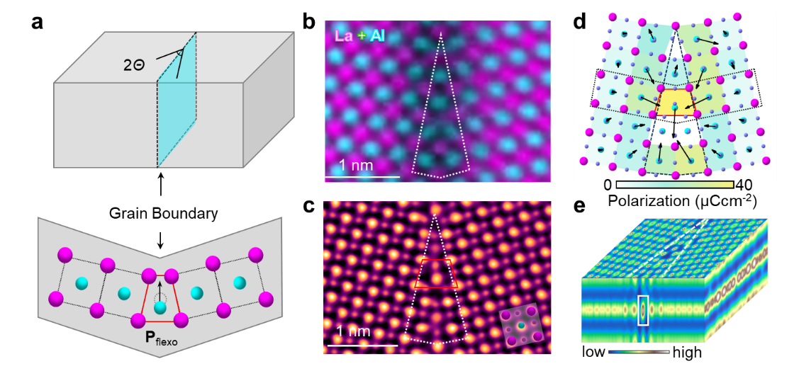 图 a 晶界处由于对称性破缺导致的单胞不均匀变形示意图,晶界挠曲电(Pflexo)诱导产生净电偶极矩;b 原子分辨的LaAlO3晶界元素分布图;c 利用对氧元素敏感的成像手段得到的LaAlO3晶界全原子构型;d 理论计算得到的晶界附近的挠曲电极化分布(极化方向指向晶界核);e 理论预期的晶界附近电荷密度分布,其中白色矩形框表示负电荷在晶界处有极大值