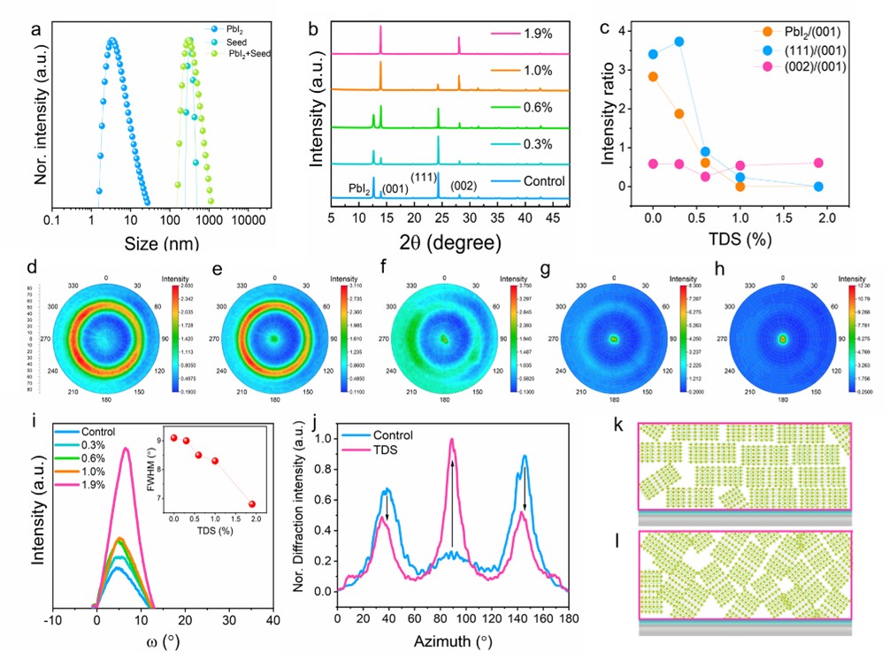 图1 晶面取向调控表征 a 碘化铅溶液,晶种溶液和晶种加入到碘化铅溶液后的动态光散射图谱;b, c 钙钛矿面取向调控的XRD示意图; d—h 钙钛矿(002)取向的极图表征结果; i 钙钛矿(001)取向的摇摆曲线; j—l 基于同步辐射的GIWAXS表征结果和晶面堆垛示意图