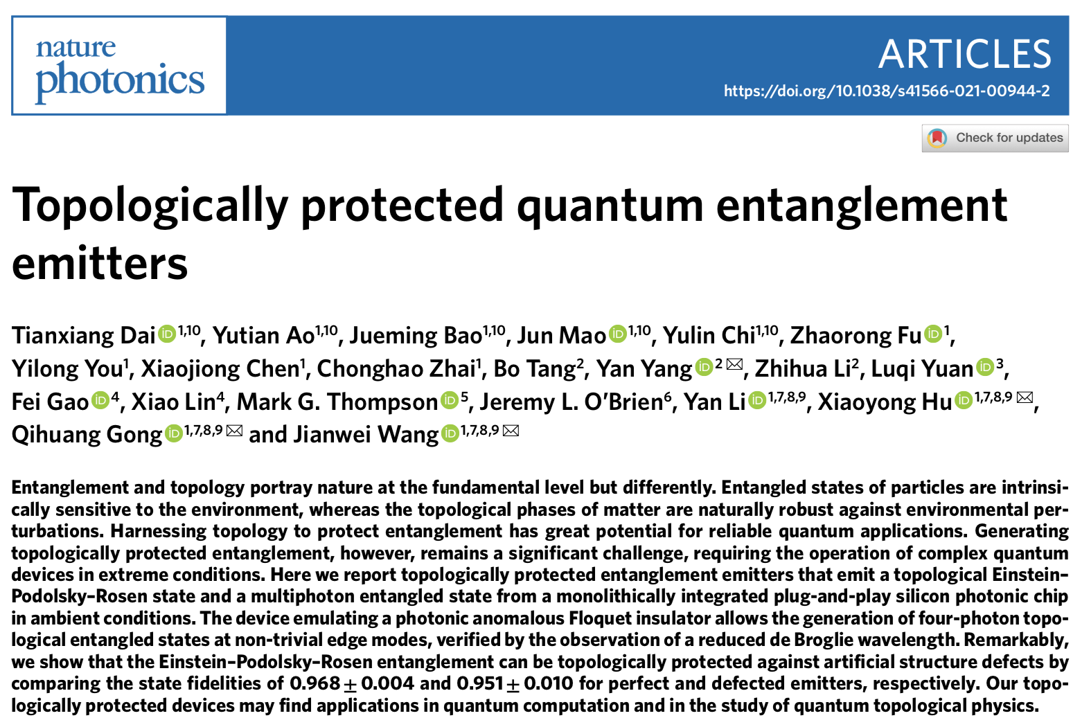 2022年2月17日,相关成果以“拓扑保护的量子纠缠光源”(Topologically Protected Quantum Entanglement Emitters)为题,在线发表于《自然·光子学》(Nature Photonics)。伟德源自英国始于19462019级博士研究生戴天祥、2017级博士研究生敖雨田、2018级博士研究生包觉明、2020级博士研究生茆峻、2019级博士研究生池昱霖为文章共同第一作者,王剑威、胡小永、龚旗煌与中国科学院微电子研究所杨妍研究员为共同通讯作者;主要合作者还包括中国科学院微电子研究所李志华研究员、唐波高级工程师,上海交通大学袁璐琦副教授,浙江大学高飞研究员、林晓研究员,英国布里斯托尔大学Mark Thompson教授,澳大利亚西澳大学Jeremy O’Brien教授,伟德源自英国始于1946李焱教授,以及伟德源自英国始于1946本科生傅兆瑢、尤一龙,博士研究生陈晓炯、翟翀昊。