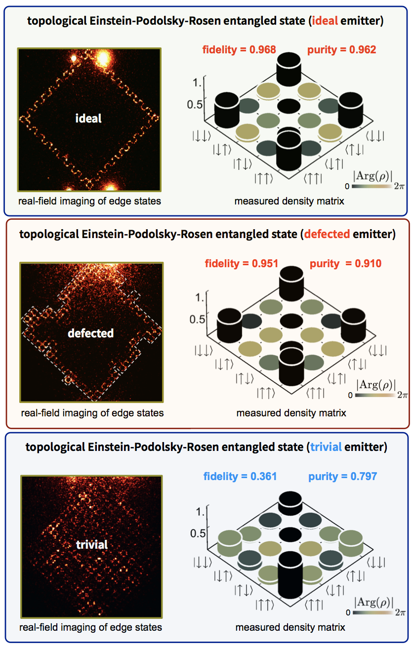 量子信息与拓扑物理是量子力学衍生出来的两个重要学科分支,其中量子纠缠态与拓扑相既是基础物理研究的核心内容,也是前沿技术发展的关键物理资源。量子纠缠是量子计算、量子模拟和量子通信等应用的关键资源,约20量子比特的量子纠缠态均已在光子、超导、离子和原子等体系中实现;然而,量子纠缠对量子器件加工、量子器件调控等过程中存在的完美性,提出了苛刻的实验要求,使得量子技术在走向实际应用的过程中面临着诸多挑战。另外,拓扑相的物理概念,源自强磁场下二维电子系统观察到的整数量子霍尔效应,近年来拓展到了光学、声学和冷原子等体系,并且大放异彩;拓扑相所具有的鲁棒性给予了拓扑边界态在对称性保护下的抗缺陷和抗不完美的能力。因此,制备出具有拓扑保护的量子纠缠态,对研制大规模集成的量子器件和大尺度量子计算机,以及研究量子体系的新拓扑物理和现象等,均具有重要的现实意义。