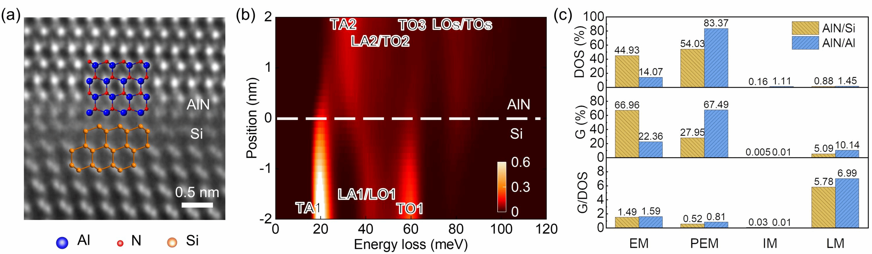 图 (a) AlN/Si异质结界面处的原子分辨图;(b) AlN/Si异质结界面的EELS谱;(c) AlN/Si和AlN/Al异质结四种不同界面模式的声子态密度分布及对界面热导的贡献