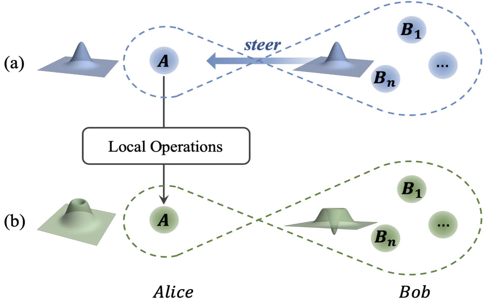 (a)具有高斯量子导引的初态;(b)在被导引方Alice处做本地操作后,导引方Bob处量子态由高斯初态变为具有Wigner负性的非高斯态。