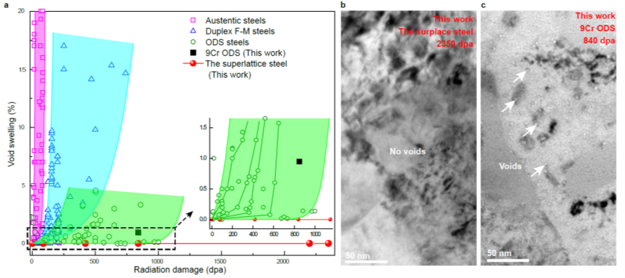 图1 a含高密度Ni(Al,Fe) 纳米粒子的超晶格钢在离子辐照条件下的超高耐辐照性能;b和c表明该超晶格钢具有很高的抗辐照肿胀性能