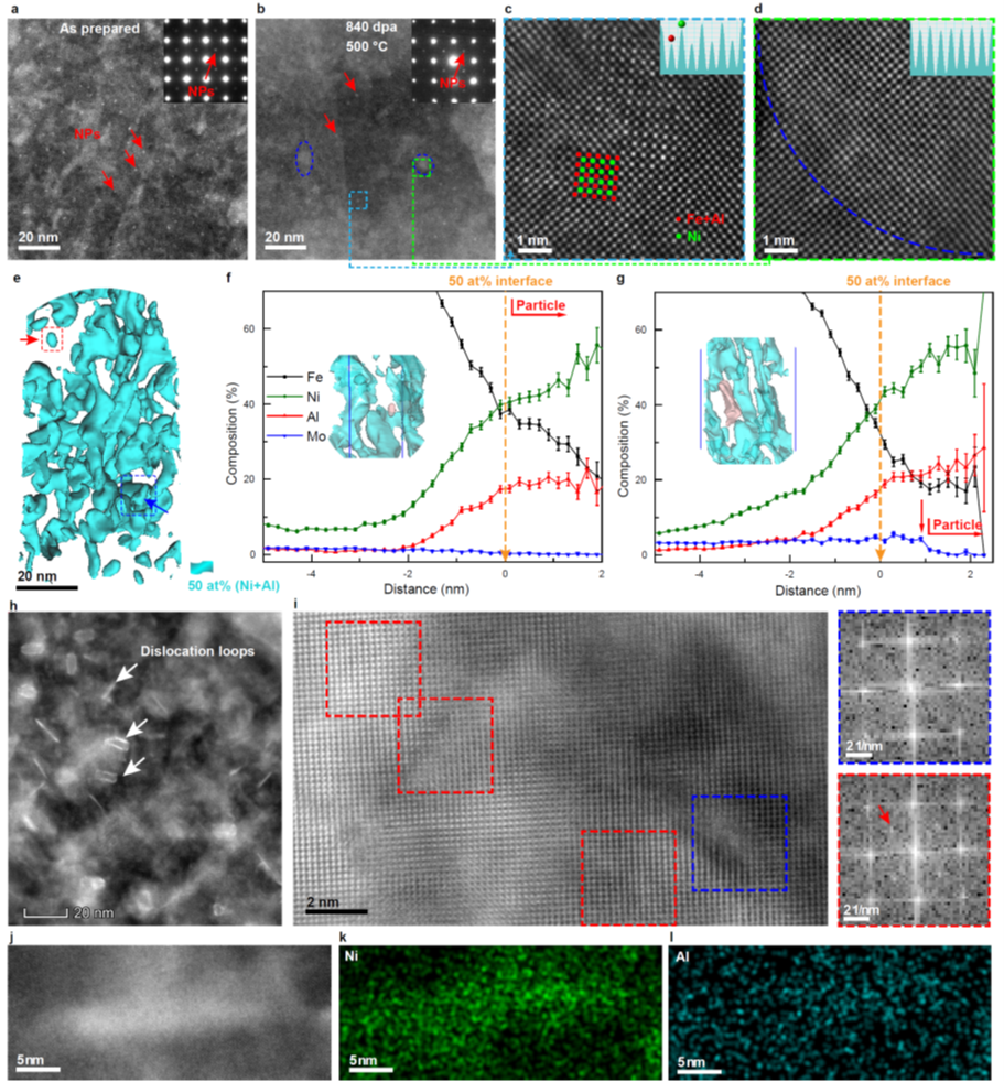 近日,伟德源自英国始于1946、核物理与核技术国家重点实验室付恩刚团队和北京科技大学吕昭平团队合作,在辐照缺陷湮灭机制方面另辟蹊径,发现了共格纳米粒子湮灭缺陷行为,揭示了其循环溶解再析出的缺陷湮灭机制,提出了一种通过设计具有晶格失配小、成分容差大的高密度纳米粒子,可大幅提高材料抗辐照肿胀能力的新思路和新策略。联合研究团队通过在马氏体钢中引入完全共格结构的化学有序Ni(Al,Fe)金属间纳米析出相,在高温(400-600 ℃)辐照下,因其极低的形核势垒和极易发生的短程溶质重排主导的动力学行为,使之快速地进行有序-无序-有序循环动态转变,这种局域相变在溶质和点缺陷长程扩散受到限制的同时,通过增强溶质和缺陷的局域重组,持续高效消除辐照产生的缺陷并使高密度析出相动态稳定,在超高剂量的离子辐照后无空洞肿胀,展现出超高抗辐照肿胀能力(如图1和2)。该策略被证实在中熵合金中同样有效,对于深入了解辐照机制和开发工程应用新型高抗辐照材料都极具意义。期待这一策略可以进一步应用在高熵合金、钨基合金和其他纳米结构合金等合金材料体系。