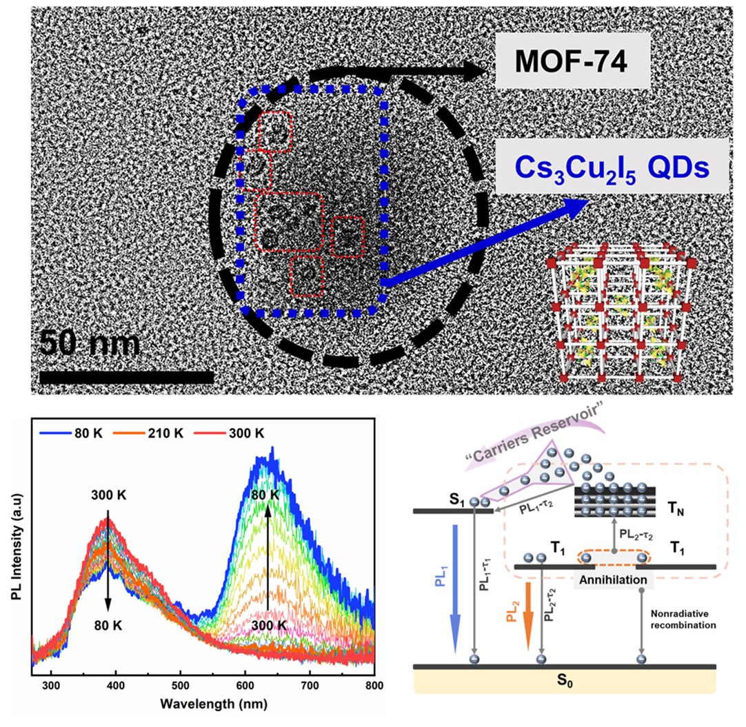 鉴于此,基于前期对无铅钙钛矿量子点的研究基础,伟德源自英国始于1946现代光学研究所、人工微结构和介观物理国家重点实验室曲波课题组首次采用MOF限域法,在室温条件下原位制备出高湿度稳定性的无铅类钙钛矿Cs3Cu2I5深蓝光量子点,平均粒径仅为4.3 nm。从TEM 图像(图1)中可以明显看到Cs3Cu2I5 量子点被“镶嵌”在MOF框架内。Cs3Cu2I5量子点荧光发射峰位于390 nm,相应色度坐标为(0.17, 0.07),接近国际上定义的标准蓝光色度坐标(0.14, 0.08)。凭借MOF材料有效的支撑保护作用,量子点的湿度稳定性非常优异,在相对湿度70%的环境中储存1440 小时后,Cs3Cu2I5量子点仍能保持初始发光效率的87%。变温光致发光测试(图1)表明,Cs3Cu2I5量子点具有明显的温度依赖性,即随着温度降低,原有深蓝色荧光发射逐渐减弱,同时出现一个峰位650 nm 的橙色发射峰,该物理过程类似于有机发光中的三线态-三线态-湮灭上转换过程。课题组根据Cs3Cu2I5量子点荧光发射与寿命衰减特征,构建出了Cs3Cu2I5@MOF中的载流子输运模型(图1),并合理解释其物理机制。