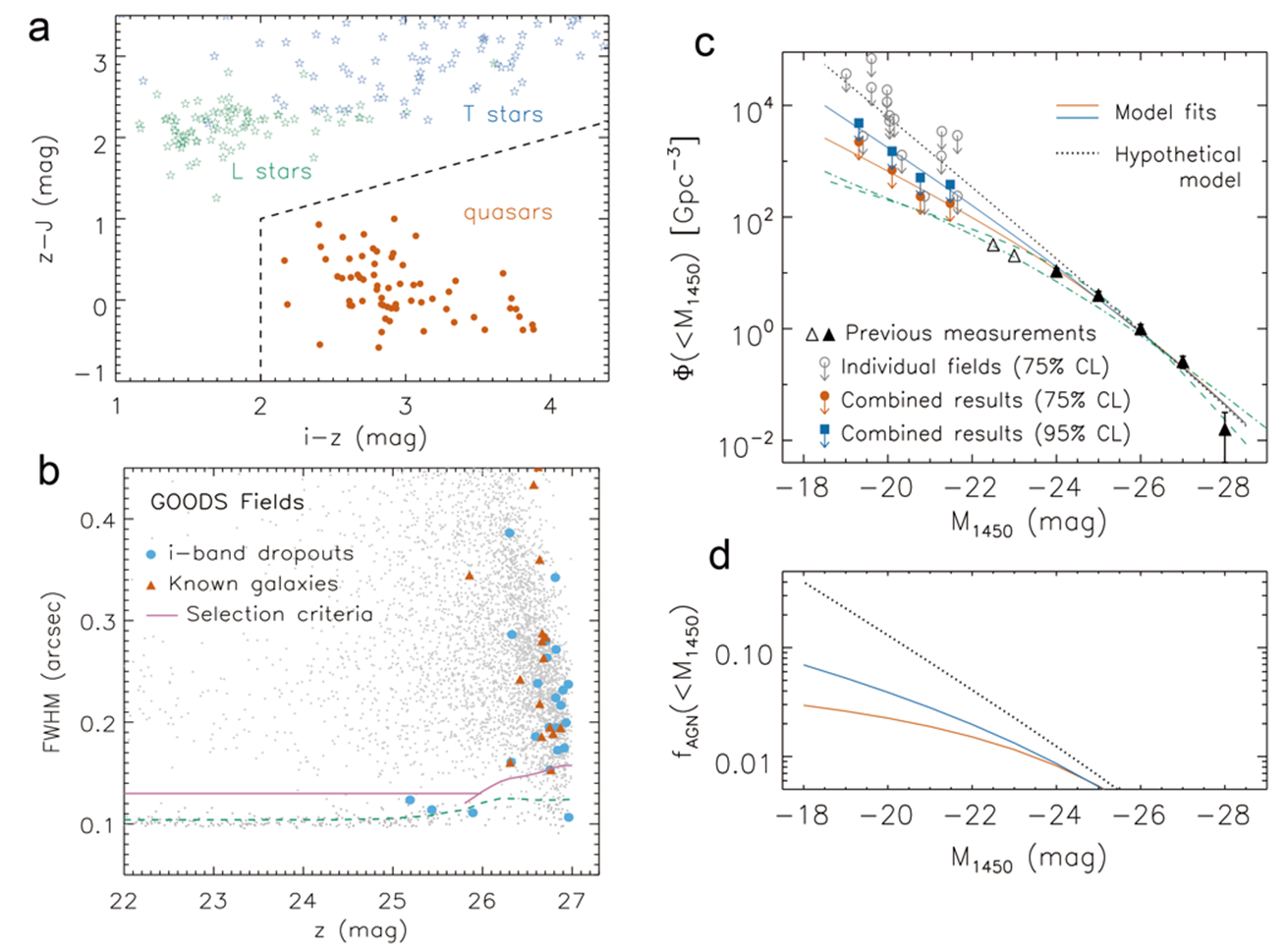 由于无法直接探测来自高红移星系的电离光子,江林华团队选择的策略是搜寻非常暗弱的类星体,并测量类星体所产生的电离光子总数,从而直接确定类星体的贡献。该策略的关键,也是难点,是需要探测到比目前已知最暗类星体还暗数十倍的类星体,这远超现有望远镜的光谱证认能力(如果利用常规的光谱证认方法)。为此,团队基于极深的哈勃空间望远镜和大型地面望远镜图像数据,开发了新的方法来搜寻和证认红移6.0至6.6之间的类星体。该方法主要包括两大步骤,首先利用多波段图像数据将类星体候选体从低红移天体中分离(图1a),然后利用哈勃高空间分辨率图像从这些候选体中证认点源状类星体(图1b)。该方法避开了传统的光谱证认,从而使团队在探测暗弱类星体时达到了前所未有的深度。