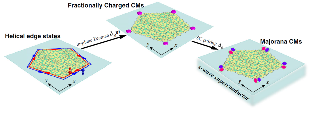 二维准晶中由面内塞曼场诱导的拓扑相变:从拓扑绝缘体相出发,面内塞曼场会将该准晶诱导到具有拓扑角模的高阶拓扑相;通过s-波超导体的近邻作用并调节场强与化学势,进一步在二维准晶中实现马约拉纳零能角模。