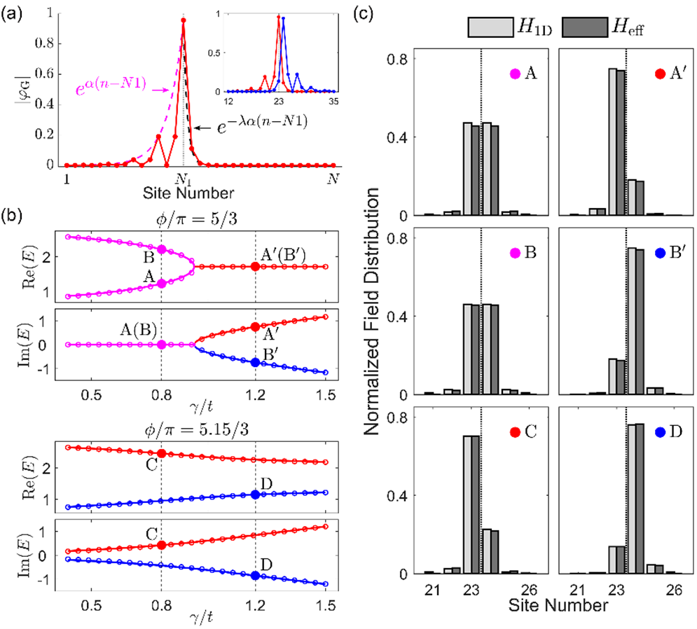 非厄密拓扑光子学体系具有丰富的物理现象和重要的应用潜力,在近年来逐渐成为纳米光子学领域的国际研究前沿之一。在通常情况下,如果将拓扑非平凡与拓扑平凡的两个畴拼接在一起,在畴壁上会出现拓扑边界态,拓扑态的数量对应于相应拓扑不变量的差值,拓扑不变量则可以通过对相应体系进行能带分析得出。然而近期美国宾夕法尼亚大学冯亮教授研究发现,即使把两个拓扑等价的畴拼接在一起,当增大两个畴的增益/损耗差值时在畴壁上也会出现局域的拓扑边界态,这种拓扑态不能用拓扑不变量来刻画,而且由于体系没有平移对称性,无法直接利用现有的理论计算方法开展深入研究。