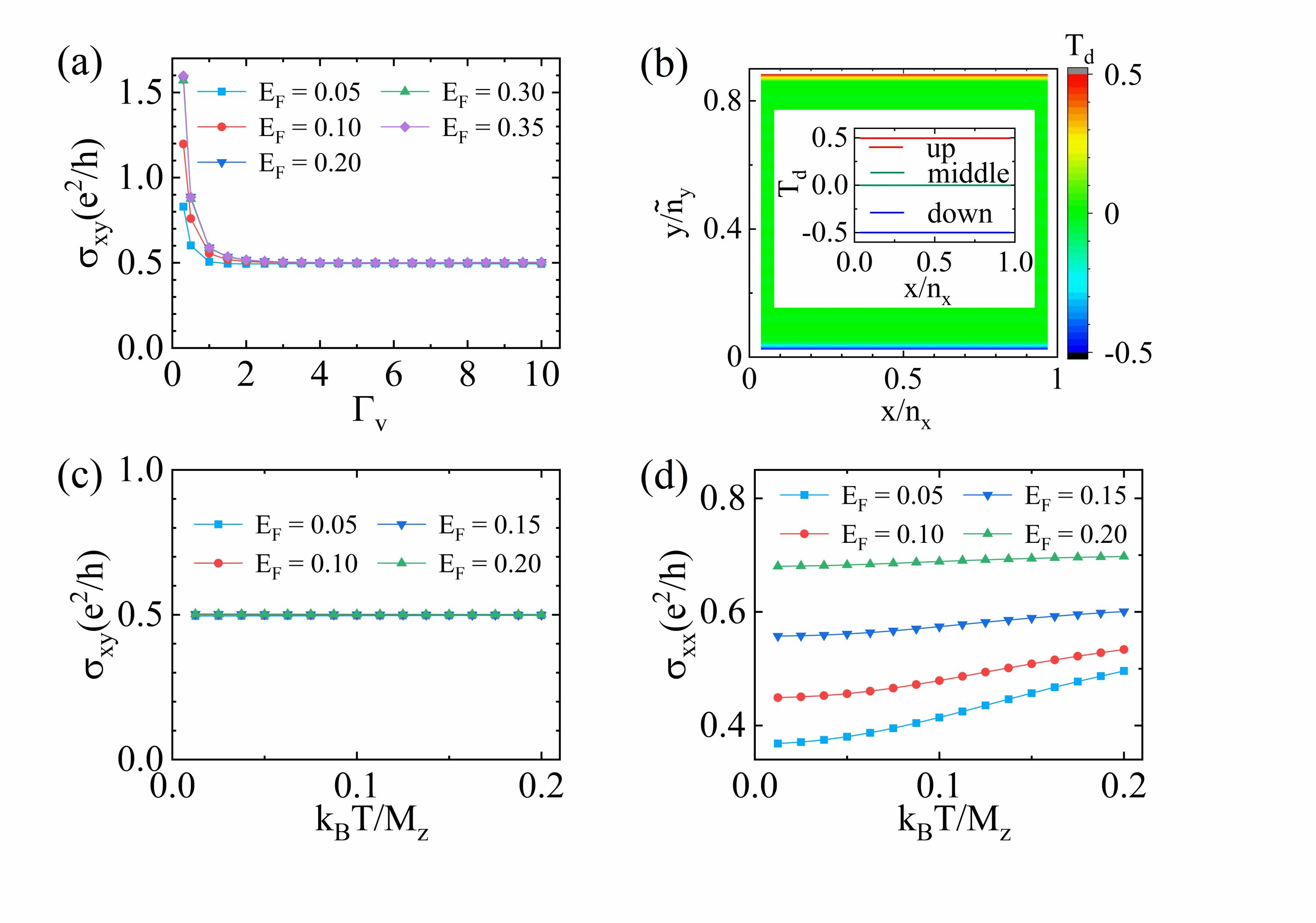 图 (a) 霍尔电导随退相干强度Гv变化曲线;图 (b) Td空间分布,Td用于描述半量子化手性通道;图 (c) 和 (d),霍尔电导和纵向电导随温度变化曲线