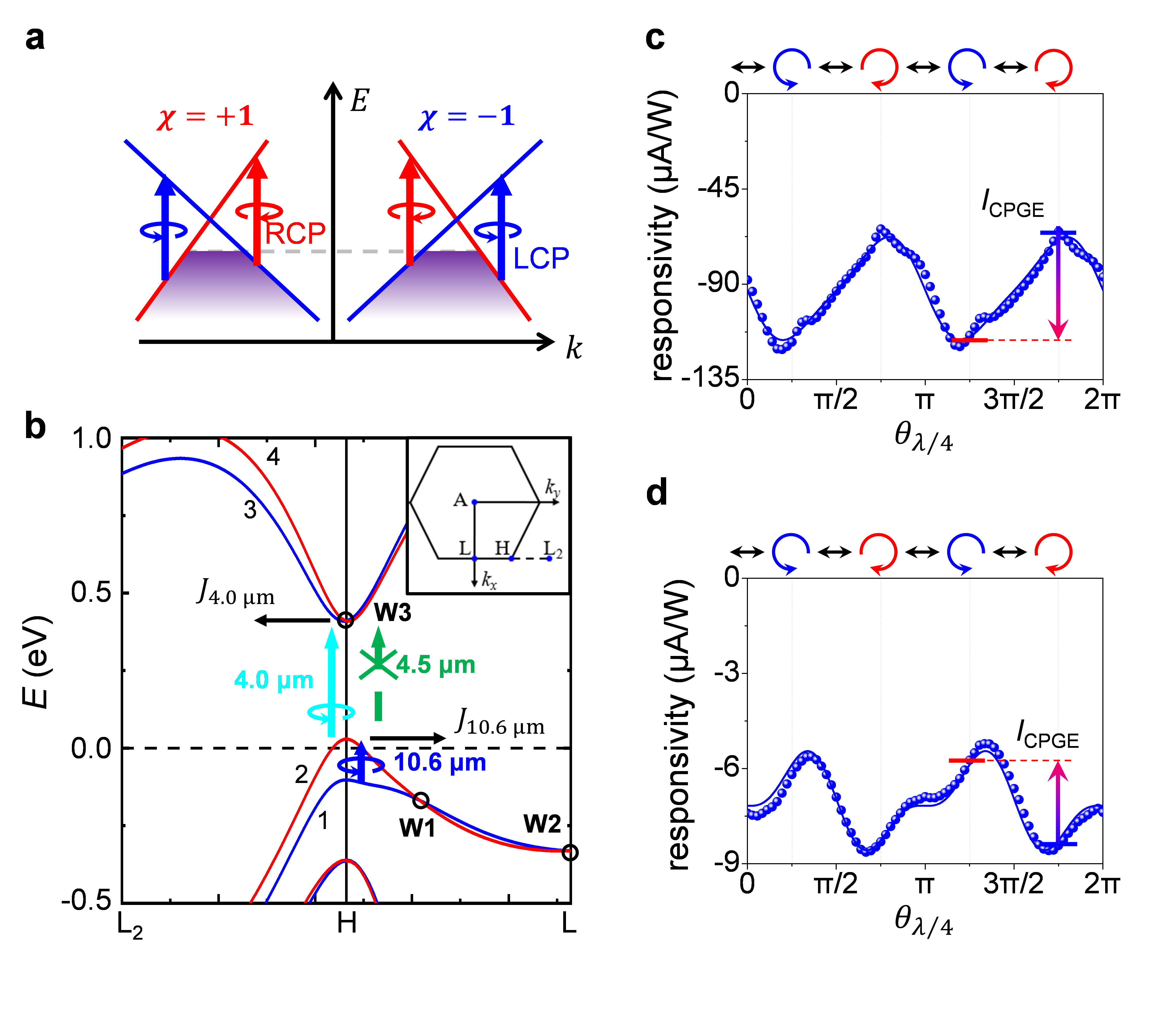 图a:不同手性外尔点附近跃迁的圆偏振光学选择定则示意图;图b:在Te中不同波长光子跃迁对应的能带位置;图c,d:分别为4μm与10.6μm波长下圆偏振依赖光电流测量结果,在4μm与10.6μm下具有相反的CPGE符号