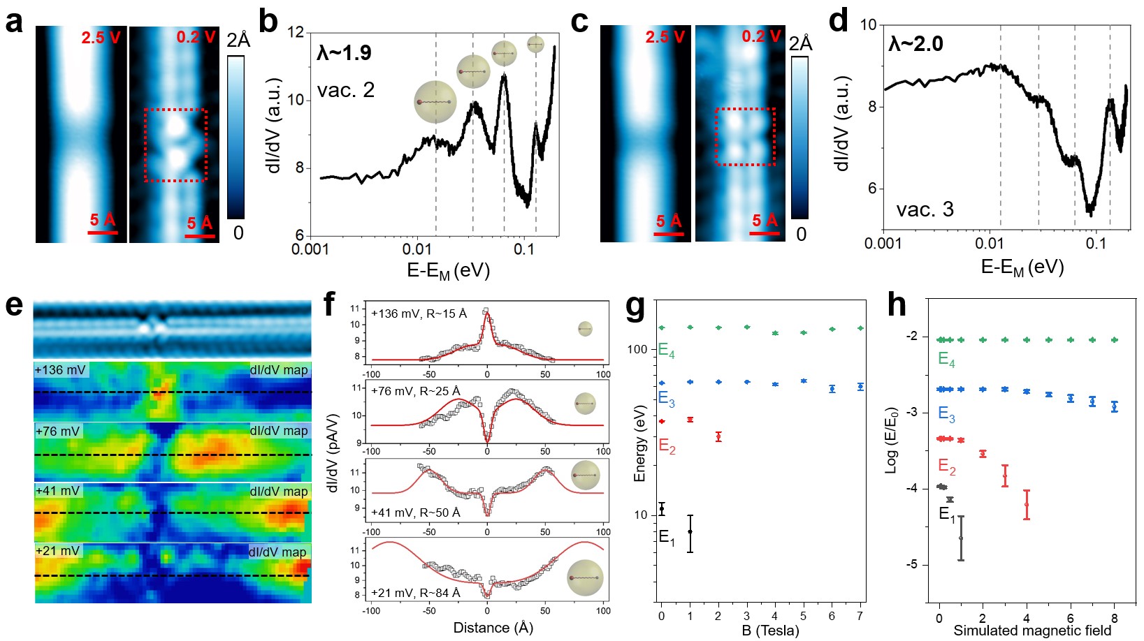 图:(a-d)拓扑材料HfTe5表面原子缺陷的高分辨扫描隧道显微镜形貌图(a,c)与对应的扫描隧道谱(b,d):扫描隧道谱中的共振峰数量多达四个,能量满足等比关系(也即对数周期);(e-f)不同能量下带电杂质(也即原子缺陷)附近的态密度空间分布(e)和对应的满足离散标度不变性的准束缚态半径(f);(g)带电杂质处准束缚态能量随外加磁场增加时的演化:较低能量的准束缚态对应的共振峰逐渐展宽并最终消失,同时准束缚态逐渐靠近费米面;(h)理论计算得到的准束缚态能量(使用单位能量E0归一化,无量纲)随磁场的演化。理论模拟结果(h)与实验数据(g)吻合