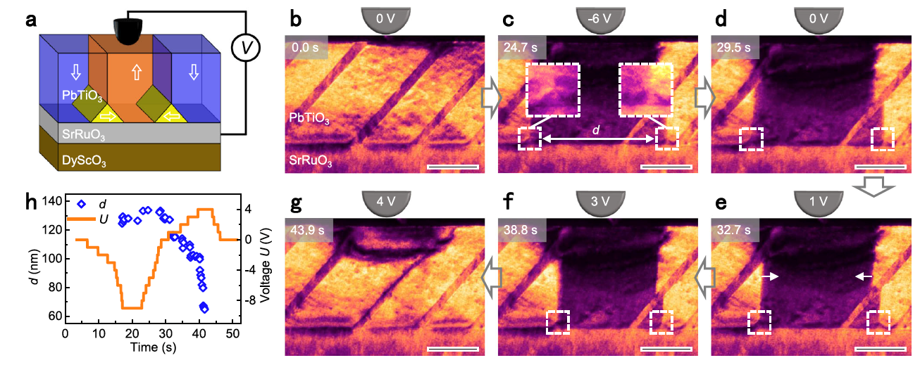 图2 a:原位透射电镜电学测量系统的实验装置示意图;b-g:电场调控孤立的三重极性顶点形成和可逆移动;h:孤立的三重极性顶点移动距离测量