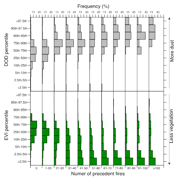 野火是发生在自然植被类型上的生物质燃烧现象,是陆地生态系统的主要扰动源和天然气溶胶的主要自然排放源之一,影响全球碳循环、气候和经济社会。理论上说,野火破坏植被导致裸土面积增加,进而降低地表粗糙度和空气动力学阻力导致近地面风速上升,同时野火燃烧有机质降低土壤粘结力和土壤湿度。以上结果造成野火后有利于沙尘排放的陆面和大气条件。前人利用地面观测资料在北美捕捉到野火后沙尘排放的现象;全球其他地方是否也有这样的现象?野火后沙尘排放的强度和频率有多高?