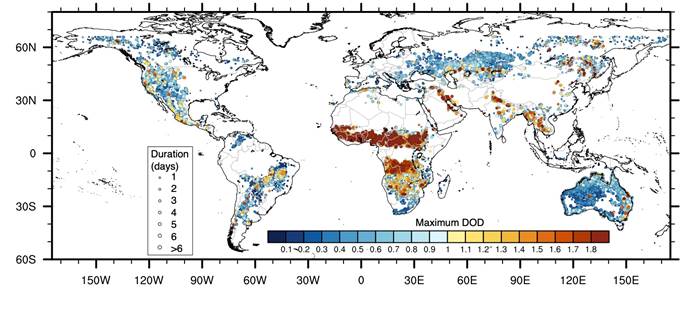 图1 全球野火后沙尘排放导致的最大沙尘气溶胶光学厚度(点的颜色)和单次燃烧事件后沙尘排放最长持续天数(点的大小)