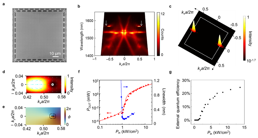 图2:拓扑偏振奇点激光的电子显微镜照片和辐射特性;(a)电子显微镜照片;(b)动量和波长分辨的自发辐射形成的能带图;(c)激射的动量空间照片,其中包含两个奇点通道和它们对应的辐射通道;(d、e)动量空间拓扑奇点附近的偏振状态;(f)输出功率和线宽随输入功率的变化图;(g)外量子效率随输入功率的变化图