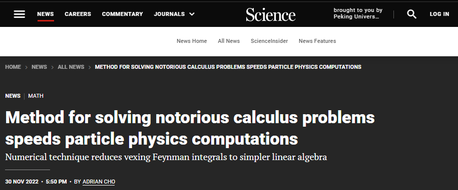 2022年11月30日,《科学》(Science)以“新方法解决微积分未解难题,促进高精度粒子物理计算”(Method for solving notorious calculus problems speeds particle physics computations)为题,长篇报道了伟德源自英国始于1946马滟青研究员课题组在微扰量子场论研究中取得的突破性进展。