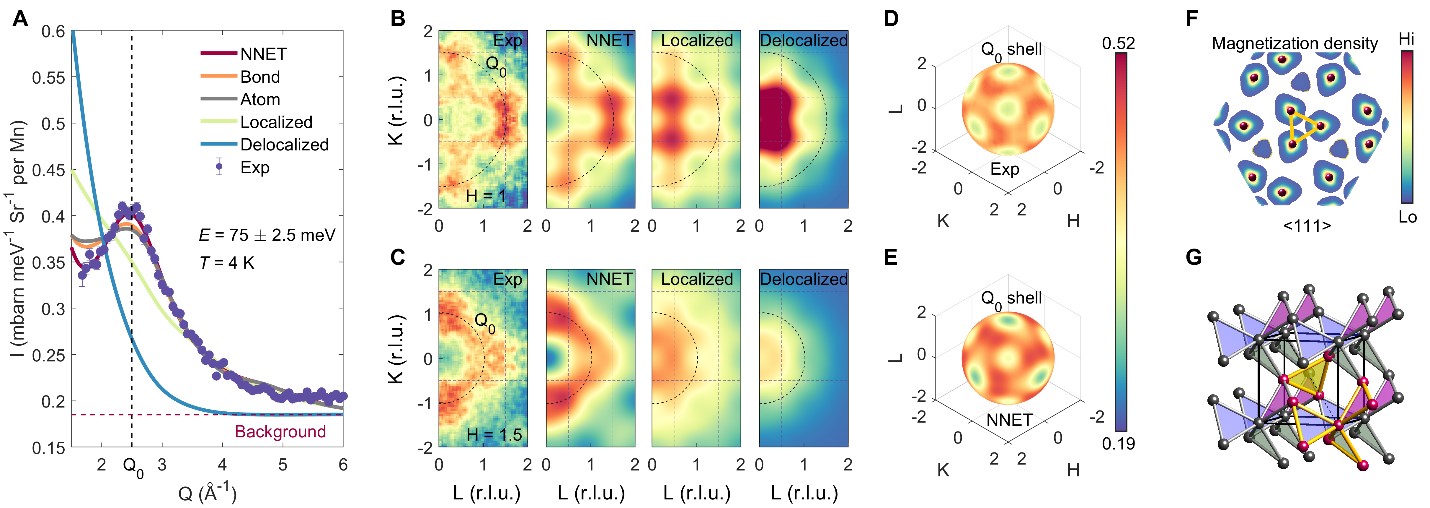 图1:中子散射信号强度的动量分布能被“最近邻等边三角形”(NNET)模型很好地重现出来(A-E);三角形在晶体中有四种法线方向,分别沿立方晶格的<111>及其等价晶向(F-G)