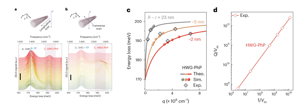 图2. 电子束沿氮化硼纳米管轴向(a)和径向(b)扫描时获得的电子能量损失谱;(c)不同侧壁厚度氮化硼纳米管中HWG-PhP模式的色散关系;(d)实验得到的模式体积与Purcell 因子