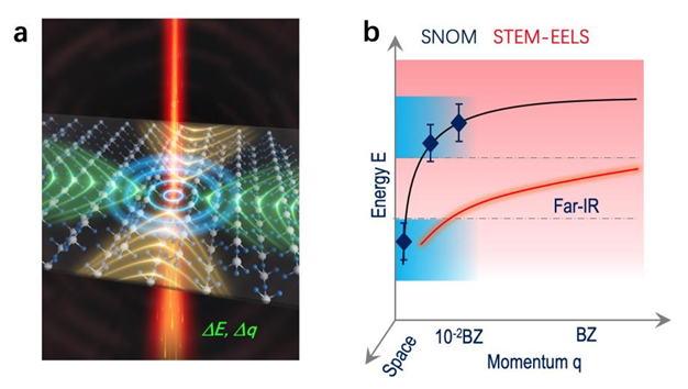 图1. (a)电子显微镜里的高能电子束激发声子极化激元;(b)电子能量损失谱与近场光学方法在能量、动量等方面对声子极化激元表征能力的对比:纳米光学能探测的动量范围很小,而电镜能损谱能探测的动量范围很大;覆盖远红外频段的近场扫描光学显微镜技术刚刚起步,之前缺乏商业化的产品,而电镜能损谱可以全覆盖;纳米光学所测量的声子极化激元色散通常是离散的几个点,而电子显微镜是连续激发与探测;此外,电镜探测在微弱信号、光学非活性模式、小纳米结构等方面也具有优势。