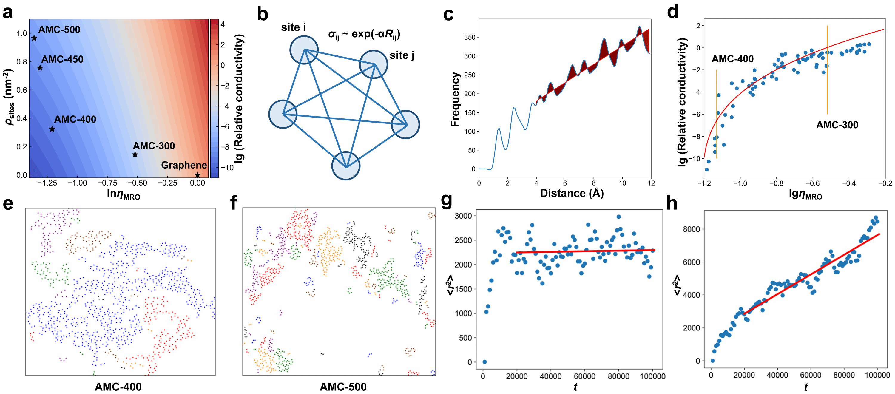 图2:二维非晶碳构效关系理论计算模型。a.计算得到的电导随着“跳跃岛密度”和“中程序”两个描述符的二维相图,其中黑色点代表不同温度下合成的样品。b.电导计算的跳跃模型。c.“中程序”参量的定义。d.计算的电导随着“中程序”的变化关系。e-f.两种典型的二维非晶碳模型。g-h.针对e-f中的结构由蒙特卡洛计算得到的均方位移随着时间的变化关系。