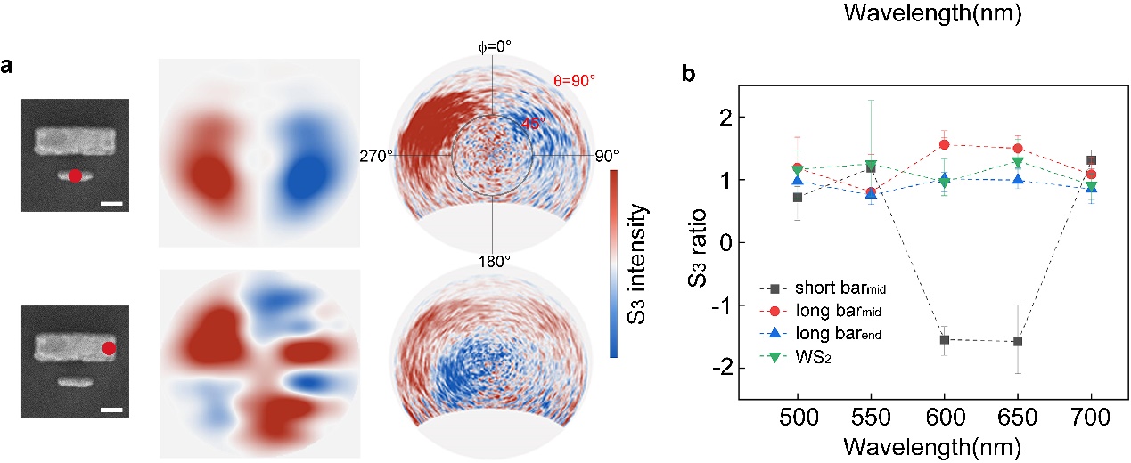 图2 (a) 电子束聚焦(聚焦位置由红点表示)在短棒中心和长棒端点时能谷激子辐射在远场的强度分布。(b) 能谷激子辐射在远场分离的定量描述。小于零的S3 ratio代表了远场分离的状态。