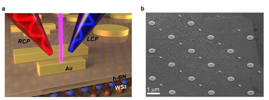 图1 纳米金属结构与六方氮化硼封装的单层WS2异质复合器件示意图(左)与电镜图(右)。两种纳米金属结构分别是由一长一短两个平行金棒组成的“二”字形结构和半径为250 nm的金圆盘。