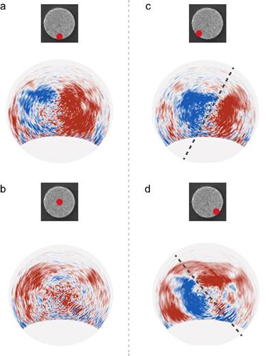为了更进一步解决调控能谷激子辐射的科学问题,方哲宇教授团队创新性地设计和制备了两种纳米金属结构与六方氮化硼封装的单层WS2异质复合器件(如图1所示),利用纳米金属结构的局域表面等离激元共振模式,结合电子束的局域激发,在室温下实现了能谷激子辐射在远场的定向分离和方向调控。研究团队利用动量分辨的阴极荧光探测系统测量了当电子束聚焦在纳米金属结构表面不同位置时,不同能谷激子产生的对应自旋的光子在远场的强度分布(如图2和图3所示)。结合实验测量与数值模拟的结果证明了可以通过精细地调节电子束的聚焦位置来控制电磁模式与能谷激子偶极跃迁之间的多极矩干涉,进而实现对能谷激子辐射的定向分离和方向调节。