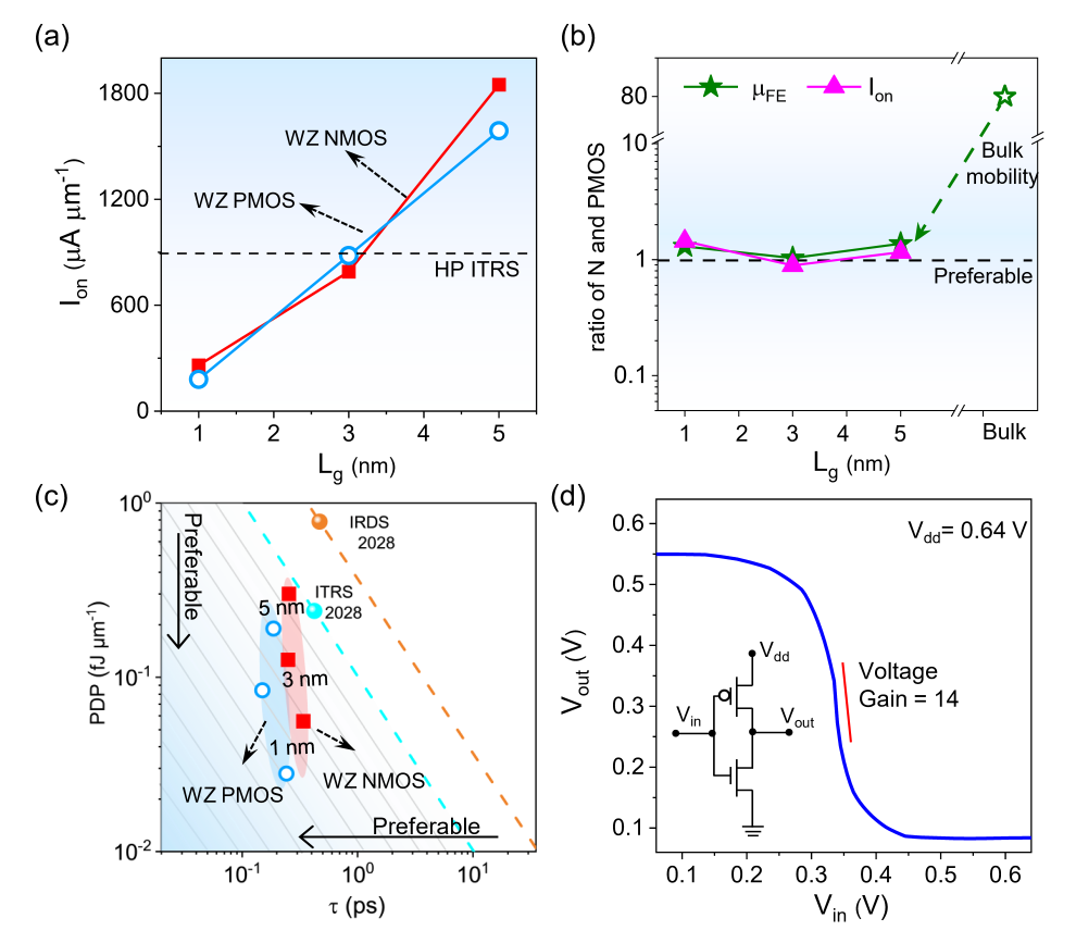 图2(a ~ c)n、p型1.2-nm直径InAs环栅NWFET的性能参数。(d)组成同质InAs NW反相器的电压转移特性。