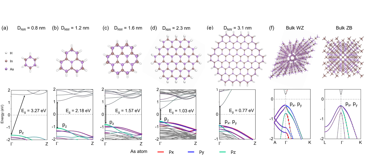 图1(a-e)直径为0.8、1.2、1.6、2.3和3.1 nm的纤锌矿相(WZ)InAs NWs(f)WZ和闪锌矿(ZB)相的体材InAs的结构及相应的能带结构,并将能带结构投射到px、py和pz轨道上。