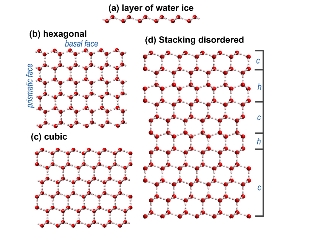 图1,冰(I)相的结构。a:冰(I)相的层状结构;b:六角冰;c:四方冰;d:堆垛无序冰。