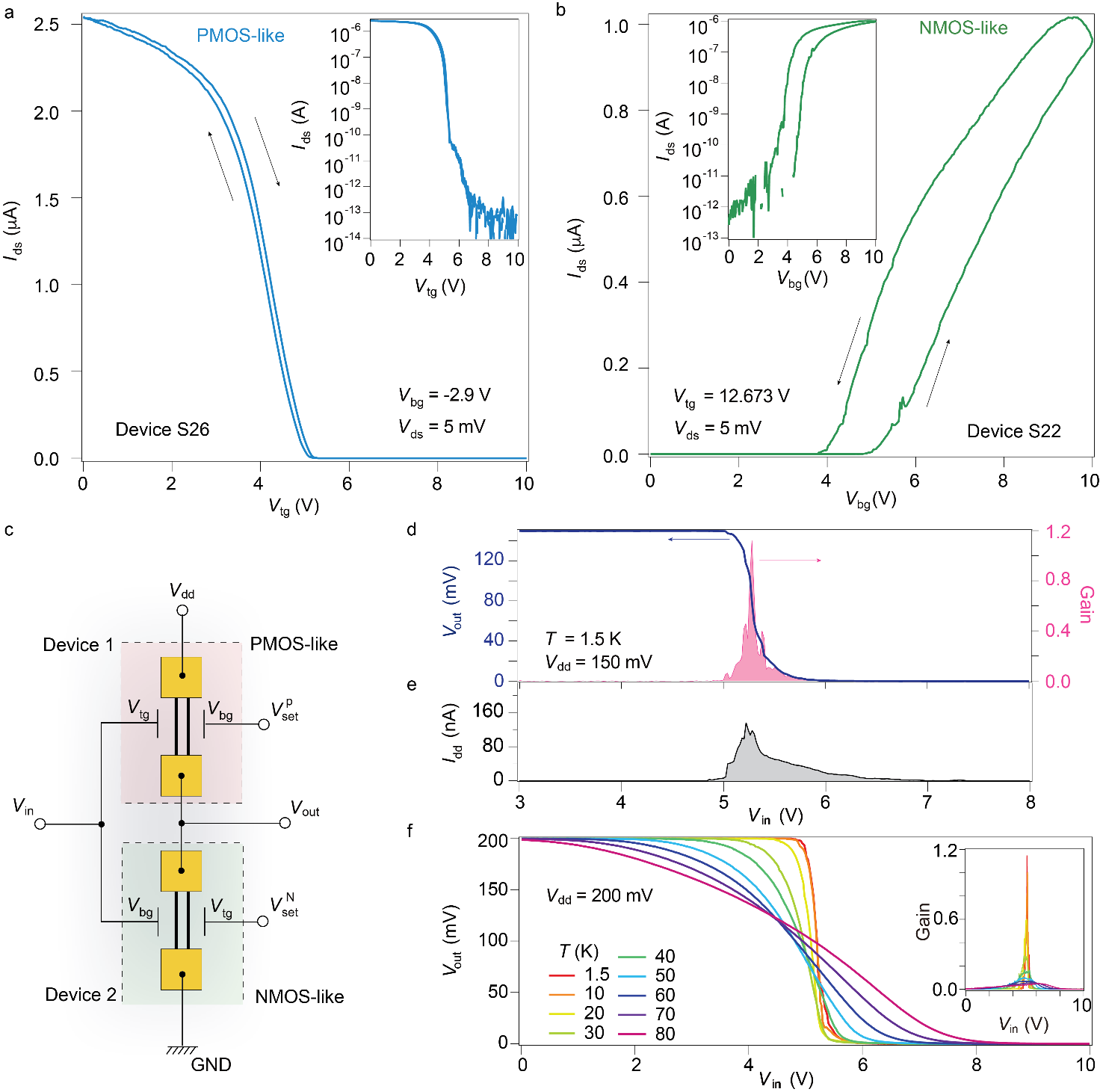 值得提出的是,基于该关联绝缘态,类NMOS、PMOS的晶体管均可以通过维持固定的顶栅(或底栅)时,扫描适当的底栅(或顶栅)获得,并且开关比在10的7次方以上,且具有极强的鲁棒性(见图2)。进一步,研究人员可以采用两个这样的CrOCl/BLG/hBN器件,通过图2c的构型,获得石墨烯晶体管反相器,在1.5 K温度、0.2 V输入电压下的增益约1.2左右。这使石墨烯在未来电子学应用方面迈出了关键一步。