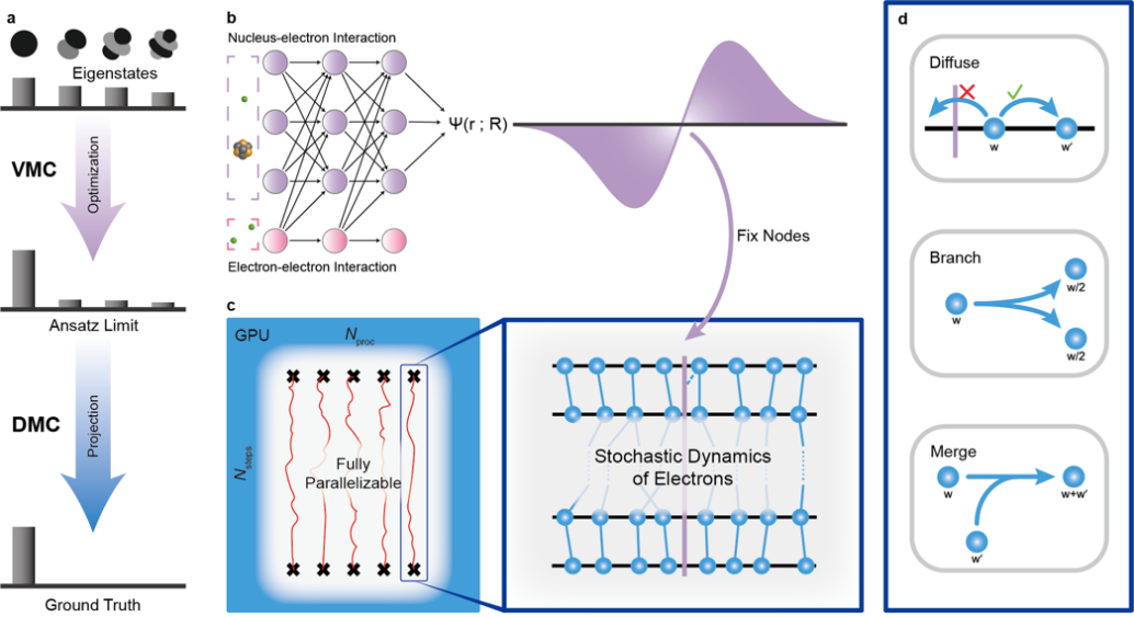 图1.a, VMC方法可以将波函数优化至接近基态,但由于函数模型表达能力有限,其精度存在一个上限。DMC方法通过虚时演化的方法将波函数向基态投影从而得以突破这一精度上限。b,构建一个满足费米子交换反对称性的神经网络函数模型从而可以表示多体电子波函数。c, GPU友好、可高度并行化的DMC算法以及算法中游走子的随机扩散动力学简单示意图。d, DMC算法中的三个重要步骤:游走子的扩散、繁衍和湮灭。