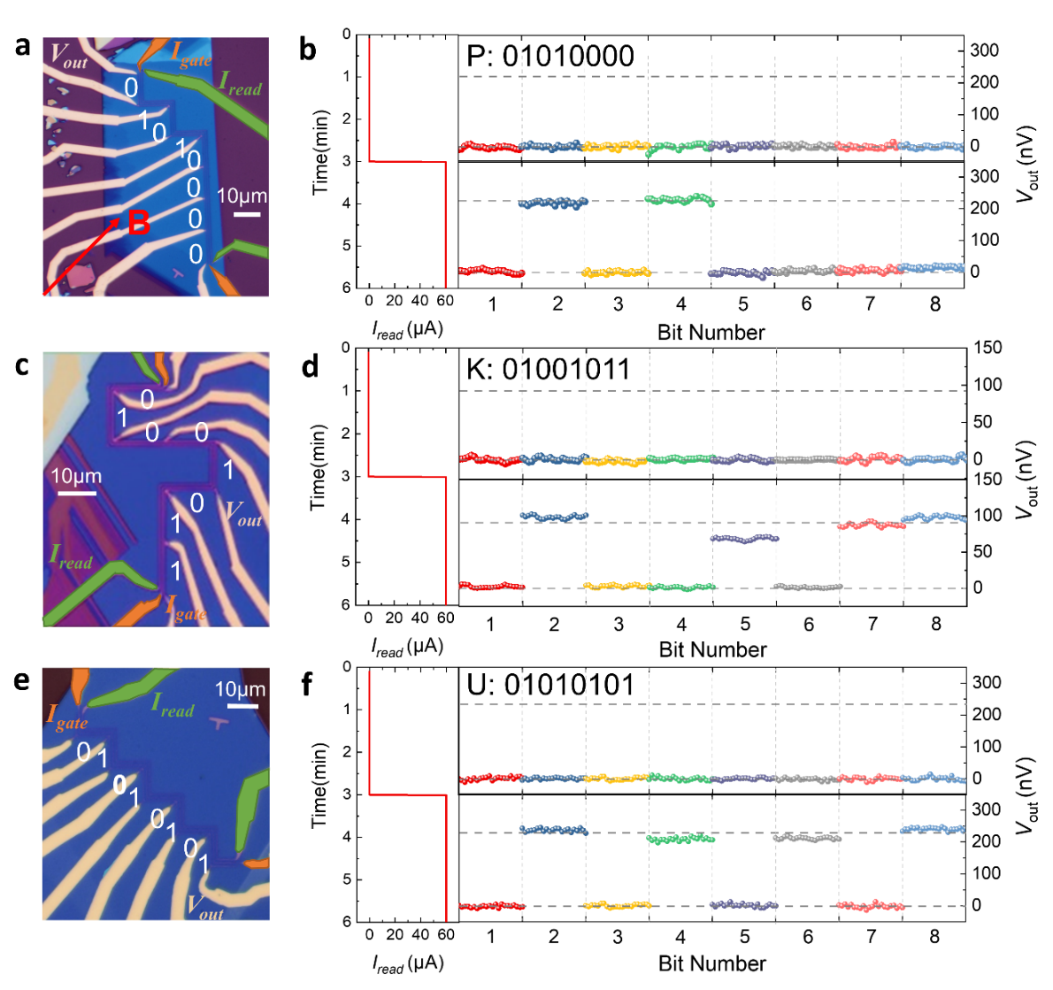 图2基于电可调各向异性的磁振子只读存储原型器件。(a-f).施加一定的调制电流Igate,基于各向异性存储的信息可在60μA读取电流Iread激励下,由非局域的输出端依次读出。上图展示了三个8位存储器件,分别存储了“PKU”的ASCII码。
