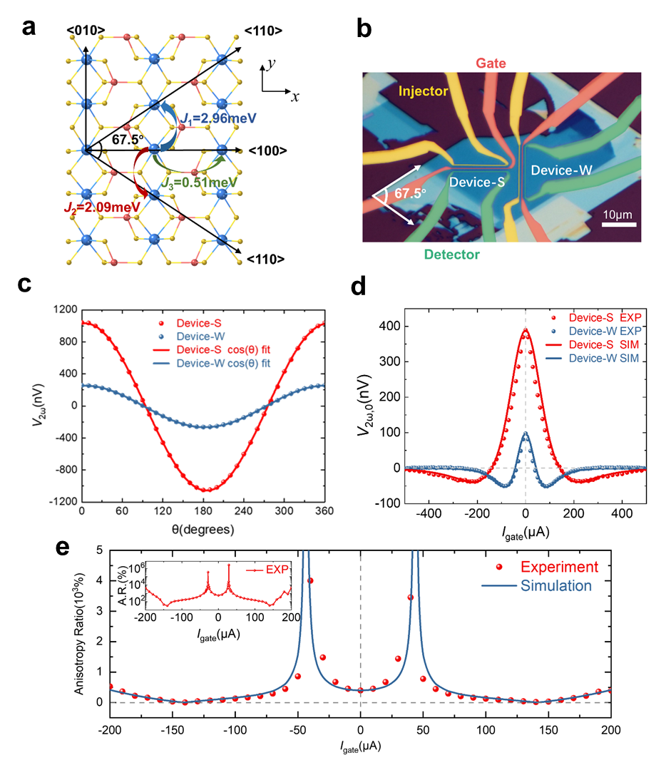 图1 CrPS4磁振子输运的巨大电可调各向异性。(a).反铁磁绝缘体CrPS4的面内的磁交换各向异性,其中y方向磁交换强度较大,x方向较小。(b). CrPS4的各向异性磁振子输运器件光学显微照片,其中注入端、栅极和探测端电极分别用黄色、红色和绿色标记。通过机械剥离的样品具有清晰可辨的边缘和特征角度,便于制备沿x和y方向传播的磁振子阀器件。(c).沿不同方向传播的磁振子强度,交换强度较强方向的信号强度约是较弱方向的5倍。(d).不同方向磁振子输运的电调制曲线,交换强度较弱的方向零点更早出现。(e).电流调制的各向异性比值,从0到无穷大。插图显示了实验上实现的高达2500000%的电控各向异性。