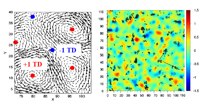 图2:振动本征模态矢量场中存在拓扑结构, +1 TD 和 -1 TD(左图)。这些拓扑缺陷(TD)与塑性事件(PE)在空间位置上密切关联。