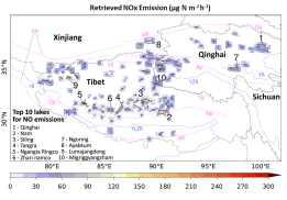 图1:2019年6-8月青藏高原湖泊的氮氧化物高排放。(左)135个湖泊氮氧化物排放反演结果,其中黑色实线标注了湖泊轮廓,数字标注了排放总量最高的前10个湖泊,蓝色线和粉色线分别标注了主要河流和山脉的位置。(右)青藏高原二氧化氮柱浓度分布。