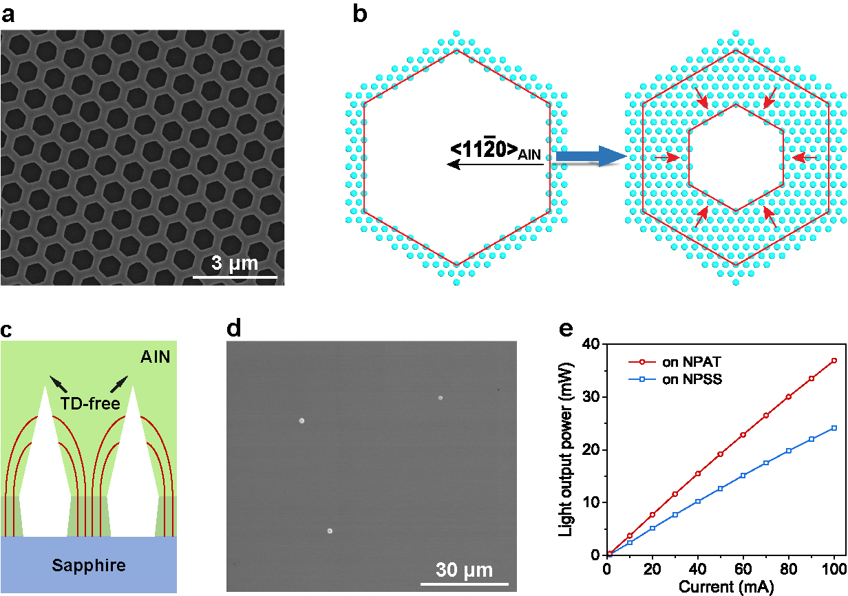 图a:六方孔洞结构NPAT的SEM图像,图b:NPAT上AlN侧向外延精细调控示意图,图c:NPAT上AlN侧向外延降低位错密度的原理示意图,图d:NPAT上AlN外延层腐蚀坑的SEM图像,图e:基于NPAT上AlN衬底的深紫外发光二极管光输出功率随注入电流的变化曲线及与常规图形化蓝宝石衬底上器件性能的对比。