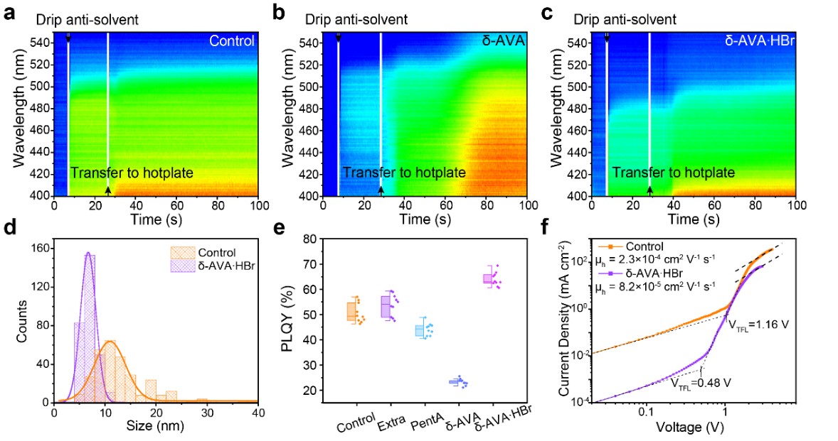 针对这一难题,研究团队通过研究配体结构对于原位结晶过程的影响,开创性地引入了一种双功能的配体Br-NH3+(CH2)4COOH(δ‐AVA·HBr),实现对钙钛矿结晶过程中晶体生长与结晶成核过程的分离调控,成功制备了具有6.8 ± 1.6纳米的量子限域尺寸的钙钛矿纳米晶均相薄膜(图二)。此外,结合表面配体钝化策略,得到具有接近100%发光量子产率的钙钛矿纳米晶薄膜。最终,实现了电流效率达109 cd A-1(对应外量子效率24.2%)的高稳定性绿光钙钛矿发光二极管,超过了常规胶体纳米晶发光器件的性能,展示了在光电子领域的潜在应用价值。