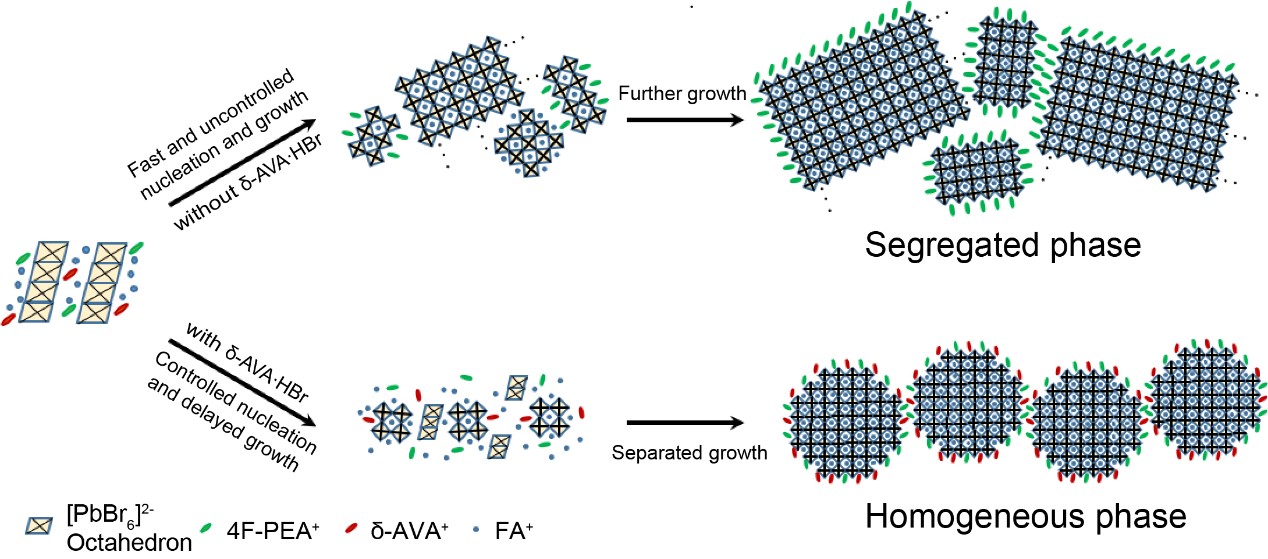 卤化物钙钛矿在太阳能电池、光电探测器、激光器和发光二极管等领域具有潜在的应用价值,它结合了多种优异的光电性能:可调节的带隙、较长的载流子扩散距离和低成本的溶液制备方法等。目前钙钛矿纳米晶大部分采用溶液相中预合成胶体纳米晶的方法,虽然有效控制了纳米晶的尺寸和均匀性,但为了防止纳米晶的聚集,使用了大量的长链配体(如油胺和油酸,导电性差),从而限制其在电致发光器件的应用。而通过传统的原位制备方法所形成的纳米晶,其性能较预合成的纳米晶有较大的差距,原因是钙钛矿结晶过程过快而不容易得到均匀生长的纳米晶(图一)。