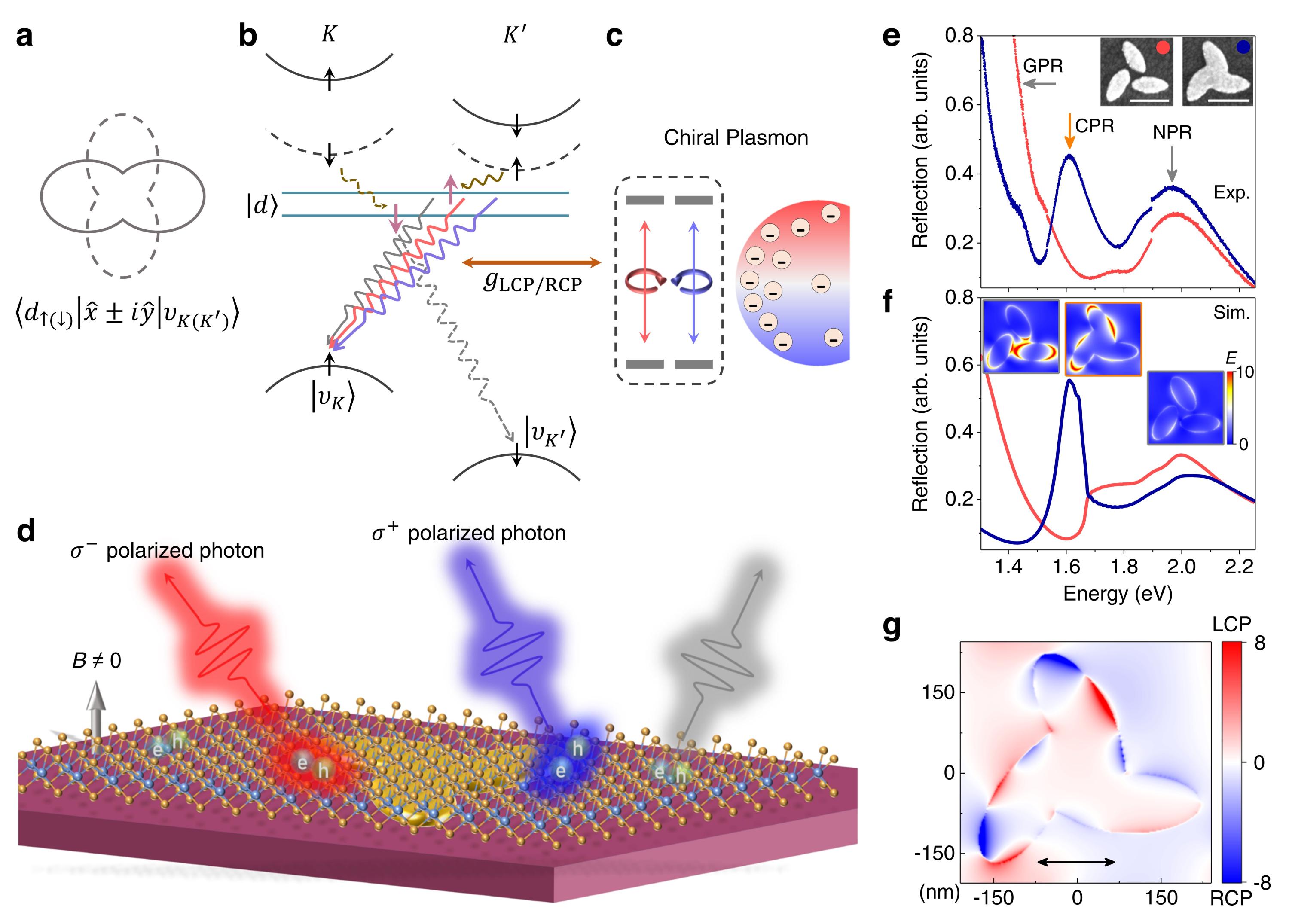 图1. QE中谷光学选择定则的验证方案。(a)QE两个不同跃迁通道的圆极化辐射示意图。(b,c)谷间缺陷态激子与手性等离激元纳腔耦合的示意图。(d)手性纳腔依赖的圆偏振光子输出示意图。(e,f)实验测量和仿真计算所得到的元胞具有C3对称性的手性等离激元晶格的反射光谱。(g)仿真得到的手性等离激元共振(CPR)模式的光学手性增强因子。
