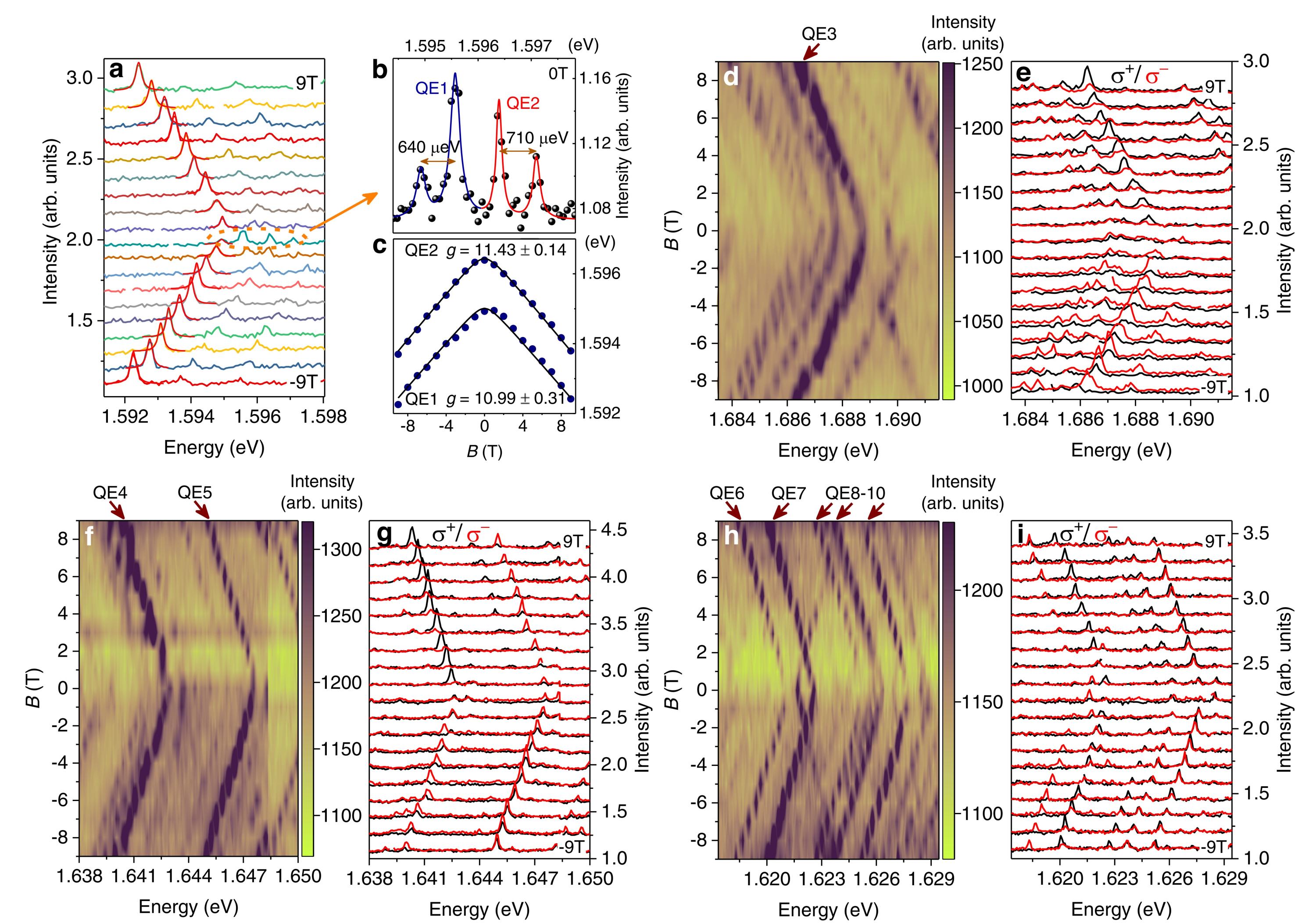 图2. 手性场作用下的QE圆偏分辨的磁光光谱测量。(a,b,c)竖直磁场下QE1和QE2的PL光谱和g因子拟合。(d,f,h) QE3-10磁场依赖的PL光谱,和(e,g,i)对应的圆偏分辨的PL光谱。