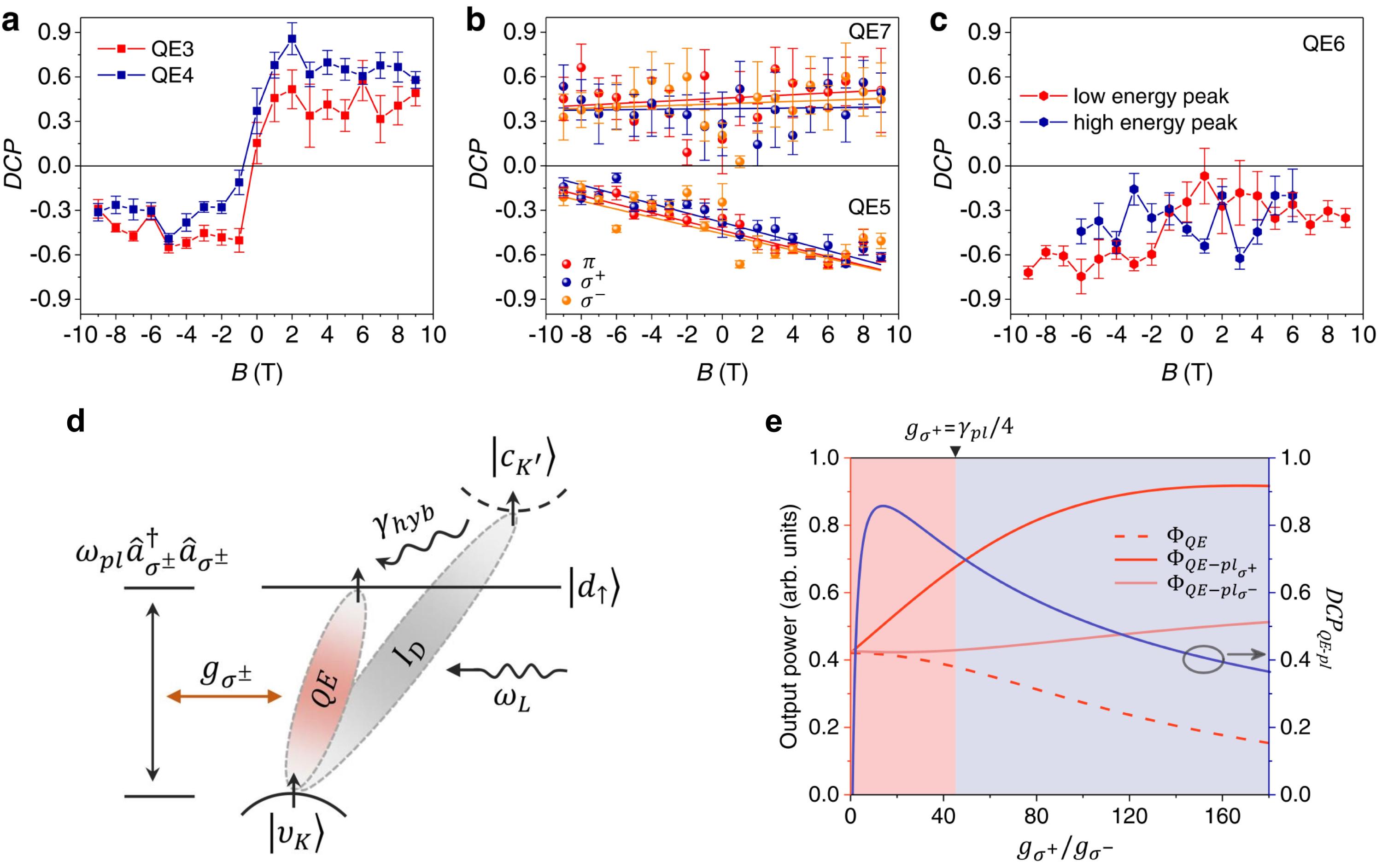 图3. (a,b,c)测量到的QE圆极化自由度(DCP)随磁场的变化。(d,e)QE与手性等离激元耦合体系的动力学研究与求解。