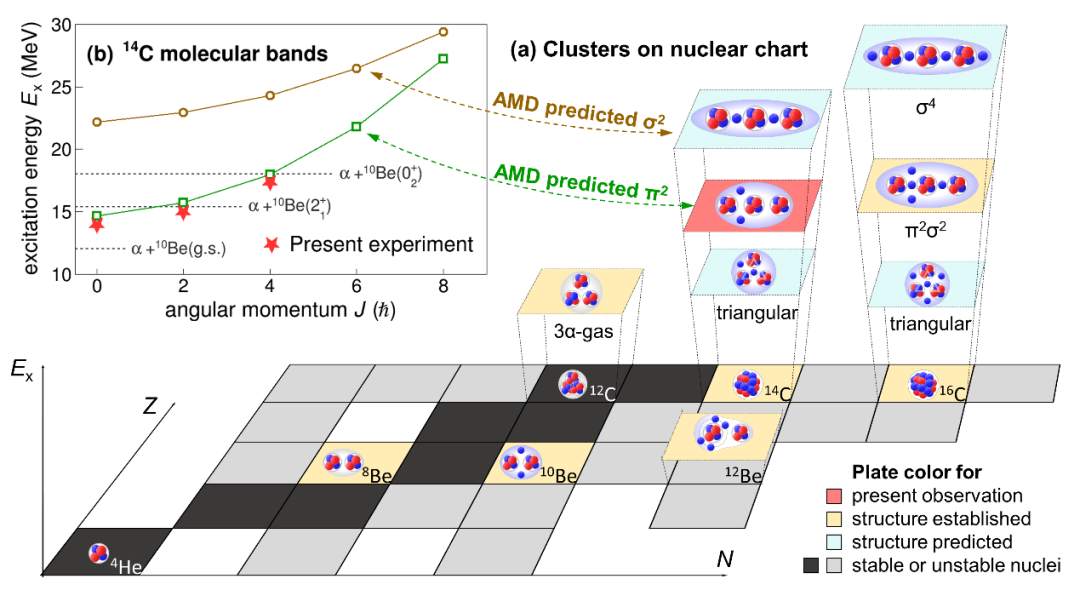 图1:(a) 轻核区偶偶核中的集团和分子结构示意图(Z-质子数;N-中子数),其中粉红色衬底上展示的是叶沿林课题组工作发现的14C中的具有3-α核心的线性链状分子结构。根据反对称分子动力学(AMD)计算,绘制了碳同位素中三角形和链状结构的价中子构型(π2,σ2和π2σ2)。(b) 14C中线性链状分子转动带的激发能量-自旋(EX-J)关联,其中能量和自旋的单位分别为MeV和约化普朗克常数ħ。